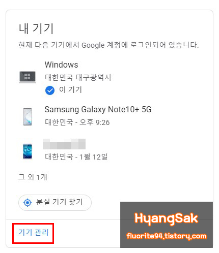 [보안] 탭에서 아래로 스크롤을 내리다 보면 [내 기기] 영역이 나옵니다. 내 기기에 나오는 기기들이 현재 구글 계정으로 접속되어 있는 기기들입니다. 로그아웃을 위해 [기기 관리]에 들어갑니다.