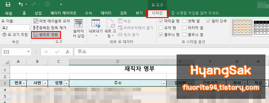 이 경우 엑셀 표로 지정된 셀을 [표 도구] - [디자인] - [범위로 변환]을 클릭하여 표에서 해제시키면 해결됩니다.