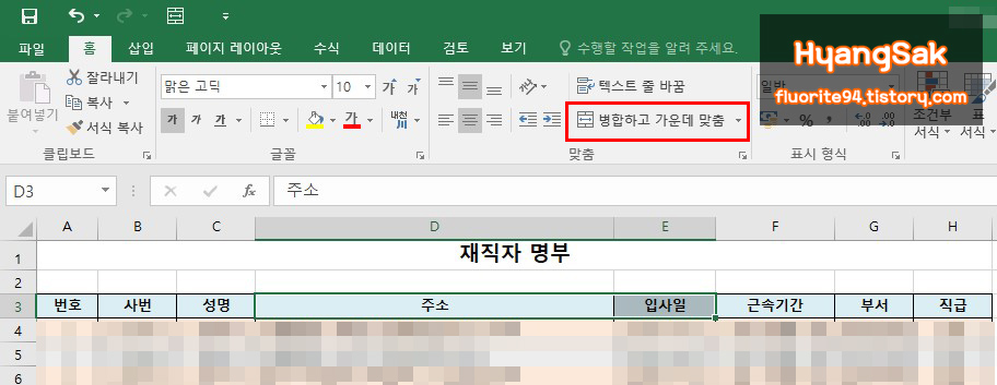 이렇게 엑셀 표를 해제하면 위와 같이 병합하고 가운데 맞춤 기능이 활성화된 것을 확인할 수 있습니다.