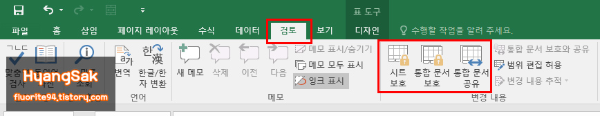 다른 방법으로는 [검토] 탭에서 위 3가지 기능을 해제하면 사용할 수 있습니다. 특히나 통합 문서 공유 기능은 많은 기능들을 해제해야 액세스 가능합니다. 예를 들어 병합하고 가운데 맞춤, 병합된 셀을 해제하는 기능, 워크시트 삭제, 조건부 서식 추가 또는 변경 등 많은 기능들이 제한되기 때문에 이러한 기능을 사용할 경우 통합 문서 공유를 해제한 다음 작업하셔야 합니다.