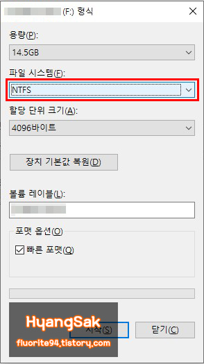 포맷에 들어가면 위와 같은 창이 나타납니다. 여기서 파일 시스템을 NTFS로 선택하고 포맷을 진행하시면 됩니다. 포맷이 완료된 다음 "OOOO 파일이 너무 커서 대상 파일 시스템에서 사용할 수 없습니다." 메시지가 출력된 파일을 다시 복사해보면 에러 메시지 없이 정상적으로 복사가 되는 것을 확인할 수 있습니다.