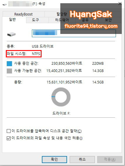 FAT32는 파일 하나당 복사, 이동할 수 있는 파일 최대 용량이 4GB라는 단점이 있지만 오래된 파일 시스템이라 구조가 단순해 구현이 쉬워 다양한 운영체제에 사용되며 기기에 대한 호환성이 좋다는 장점이 있습니다. 용량이 큰 파일을 USB에 넣고 싶다면 USB 파일 시스템을 FAT32에서 NTFS로 변경해야 합니다. 변경하는 방법은 아래와 같습니다.