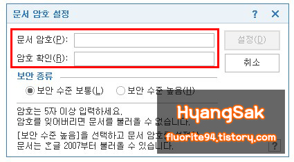 문서 암호 설정창이 열리면 문서 암호를 입력할 수 있습니다. 설정될 암호는 5자리 이상 입력하여야 하며, 암호를 잊어버리면 다른 프로그램을 사용하여 암호를 찾아야 하는데, 이 또한 확실한 방법이 아니고 시간도 오래 걸리며 암호를 찾을 수 있다는 보장도 없기 때문에 주의하여 작성하셔야 합니다. 암호를 설정했다면 저장한 다음 암호가 올바르게 설정되었는지 확인하기 위해 문서를 열어 봅니다.