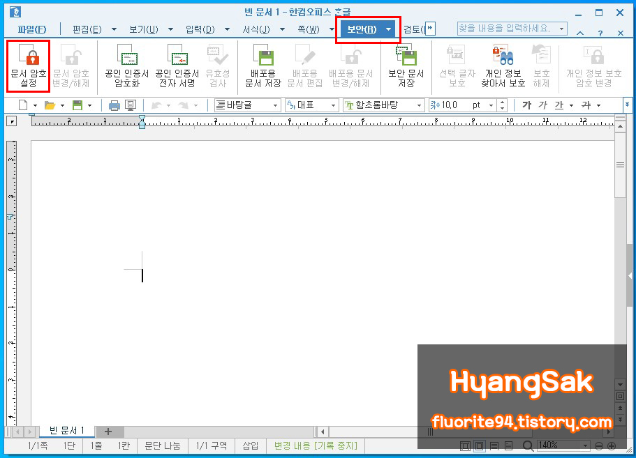 문서를 열면 상단에 [보안] 탭이 있습니다. 보안 탭에 들어갑니다.