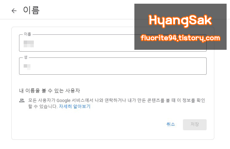 Google 계정 관리에서 [개인 정보] 탭에 들어가 하단에 있는 [다른 사용자에게 표시되는 내 정보 선택]에 있는 [내 정보로 이동]을 클릭합니다.