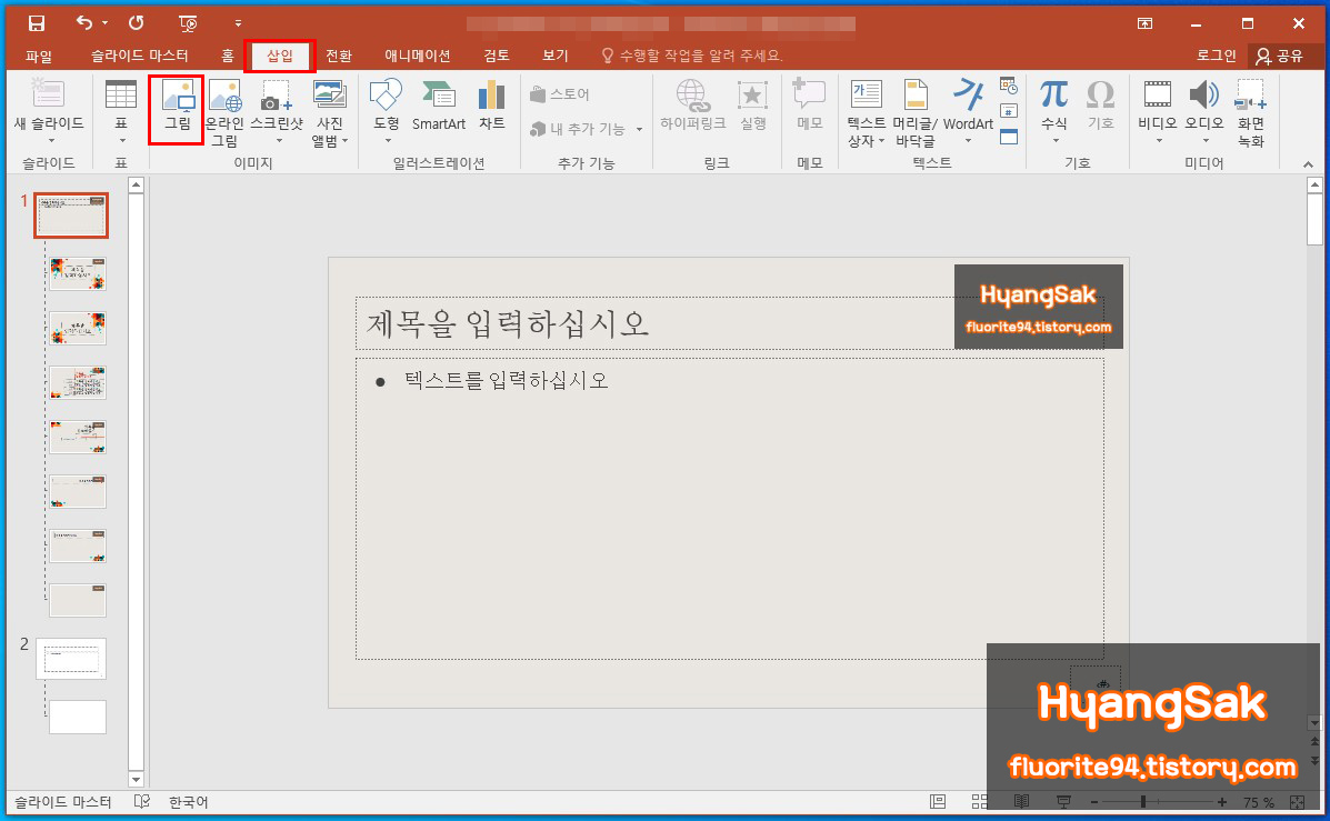 슬라이드 마스터 메뉴에 들어오면 좌측에 슬라이드 목록이 나타나는데, 여기서 최상단에 있는 슬라이드를 선택한 다음 [삽입 - 그림]을 선택하여 삽입할 이미지를 선택합니다.