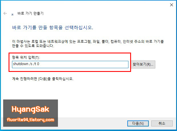 "shutdown /s /t 0"을 입력합니다.