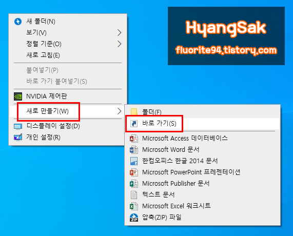 우선 바탕화면에서 빈 곳을 마우스 우클릭하여 [새로 만들기 - 바로 가기]에 들어갑니다.
