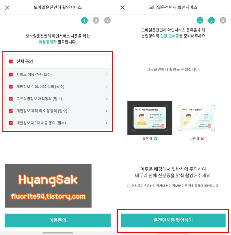 약관 동의를 하면 운전 면허증 촬영 화면으로 넘어갑니다.