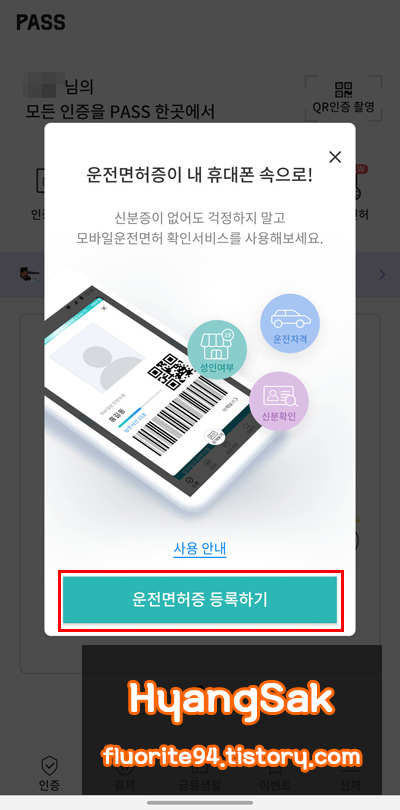 이제 다시 메인화면으로 돌아오면 등록하는 문구가 사라지고 [운전면허 확인 서비스]라는 문구로 변경되어있습니다.