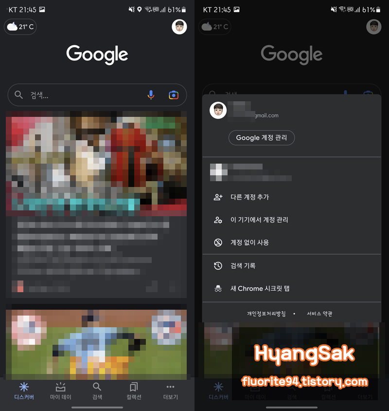 구글 어플을 실행하면 우측 상단에 Google 계정이 있습니다. 클릭하여 Google 계정 관리에 들어갑니다.