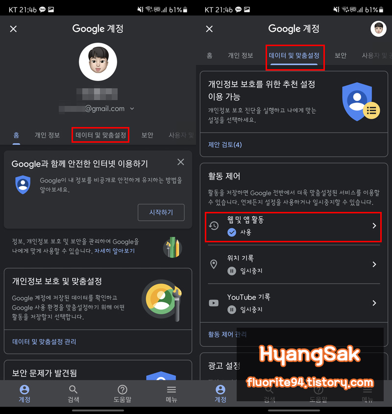데이터 및 맞춤 설정 탭을 클릭하면 활동 제어 영역에 웹 및 앱 활동이 있습니다.