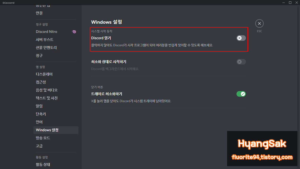 설정을 비활성화 하면 윈도우 부팅 시에 디스코드가 자동 실행되는 것을 막을 수 있습니다.