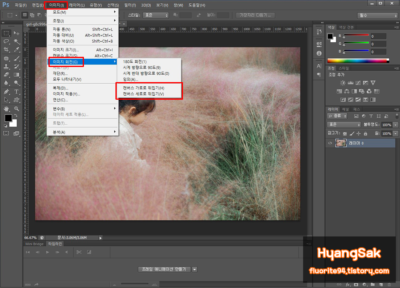 상단 메뉴에서 [이미지] 탭에 들어가서 [이미지 회전] - [캔버스 가로로 뒤집기], [캔버스 세로로 뒤집기]가 있습니다.