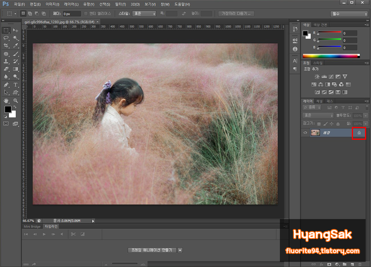 레이어 창에 잠금 표시를 더블클릭하여 새 레이어로 만들어줍니다.