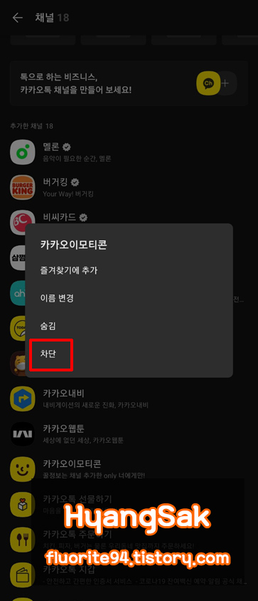 별도로 채널에 들어가서 차단을 하기 귀찮으시면 추가한 채널 목록에서 채널을 꾹 눌러 빠르게 차단을 할 수 있습니다.