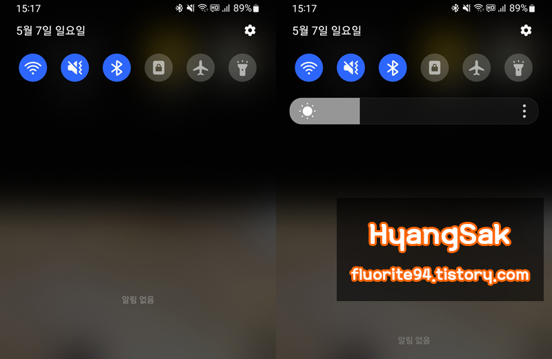왼쪽은 밝기 제어를 고정하지 않은 상태이고 오른쪽은 밝기 제어를 빠른 설정창에 고정해 놓은 상태입니다.
