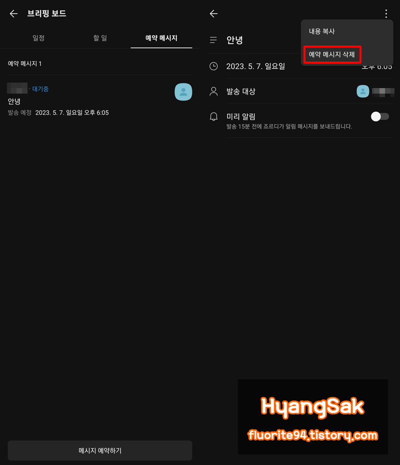여기서 다양한 메뉴가 나오는데 이 중에서 [예약 메시지]를 선택합니다.
