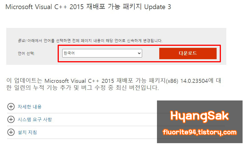 위 링크를 클릭하여 Visual C++ 2015 재배포 가능 패키지 Update 3 다운로드 페이지로 이동합니다.