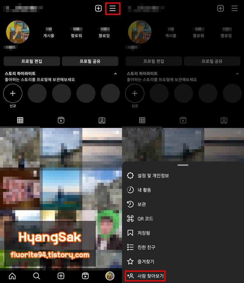 우선 인스타그램 앱에 들어와서 내 프로필에서 더 보기를 클릭한 다음 [사람 찾아보기]에 들어갑니다.