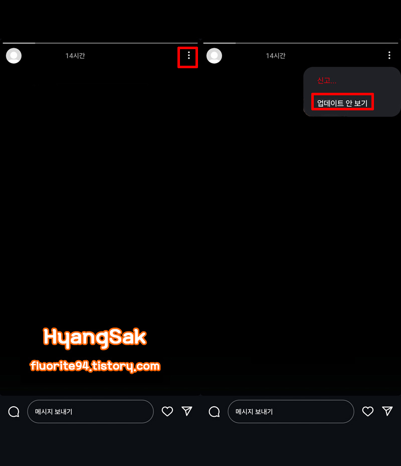 스토리 우측 상단에 세 점 메뉴를 클릭한 다음 [업데이트 안 보기]를 클릭합니다.