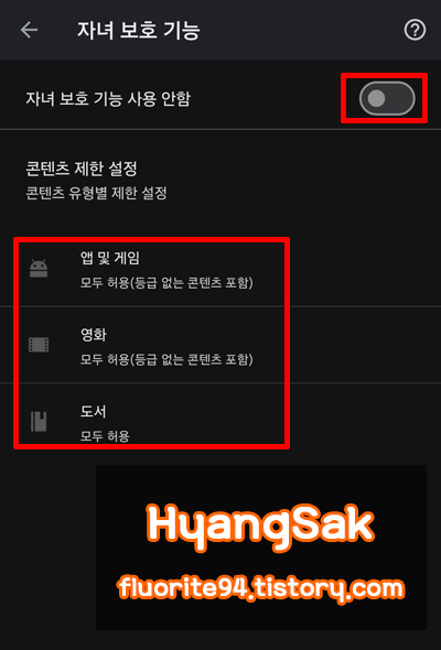 여기에서 자녀의 나이에 맞게 설정하여 자녀 보호 기능을 사용하시면 됩니다.