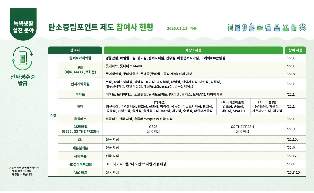 탄소중립포인트 녹생생활 실천 홈페이지에서 참여기업 안내를 통해 확인할 수 있습니다.