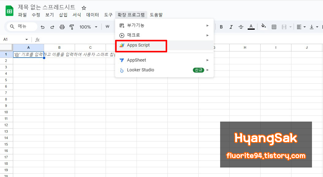스프레드 시트 상단에 [확장 프로그램] - [Apps Script]에 들어갑니다.
