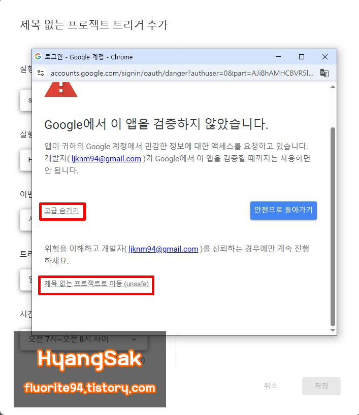 권한을 승인하는 방법은 계정을 선택하고 경고 화면 아래에 고급 버튼을 클릭한 다음