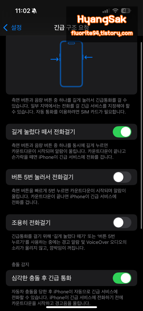 - 설명: 긴급 SOS를 실행할 때 경고음 없이 조용히 긴급전화가 걸리도록 설정할 수 있습니다.